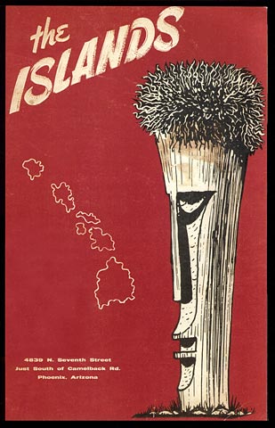 name: The Islands style: freeform height: 60 inches wood: Hackberry finish: golden oak stain; gloss spar varnish tools: flat chisels and miter saw price: SOLD My first large carving, made using only 3 carpentry chisels and a miter saw. It's based on the tiki depicted on the menu cover of the old Islands Restaurant in Phoenix, AZ. That menu art was based on actual carvings by Milan Guanko.